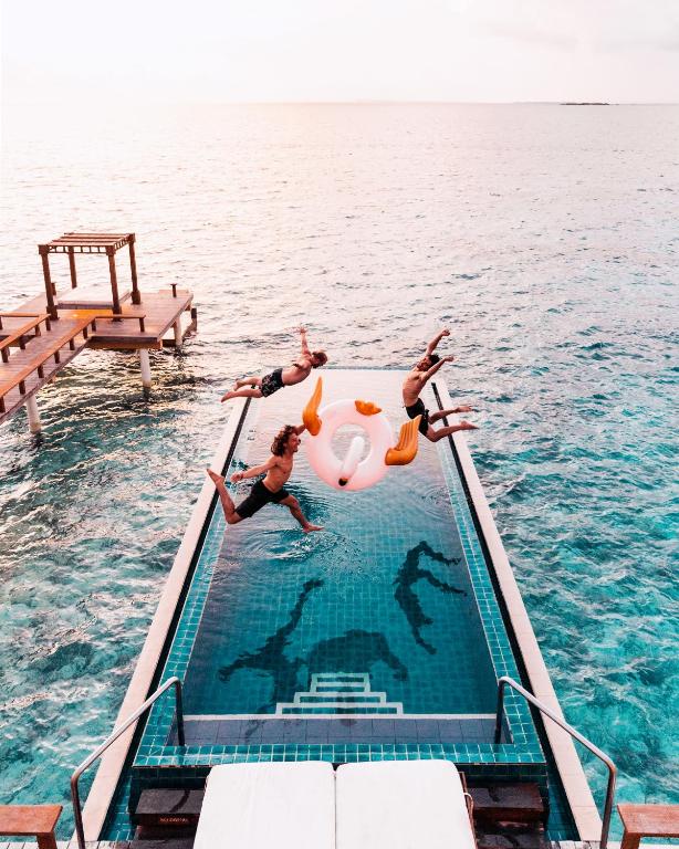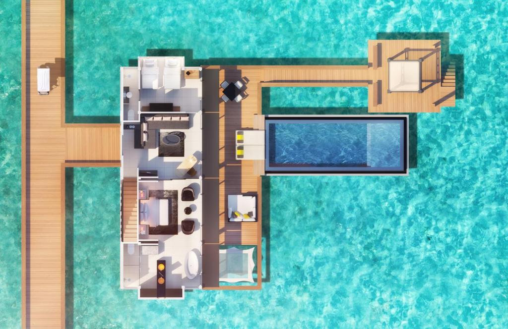 The two-storey, two-bedroom residence is an oasis of luxury for the family, with a prime ocean address surrounded by vibrant marine life and with direct access to the coral reef. Jump into an infinity pool stretched right above the clear ocean waters, take a nap in an ocean-suspended hammock, or suntan on a wooden poolside deck.