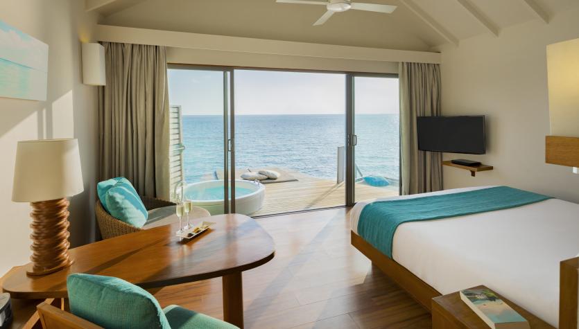 Wake to stunning views of the Indian Ocean for an early morning swim in paradise. The Deluxe Overwater Villa is set above the lagoon with steps leading down to the crystal clear waters. The romantic villa boasts 42 square metres of living space with either a king-size bed or twin beds, and a bathroom with shower.